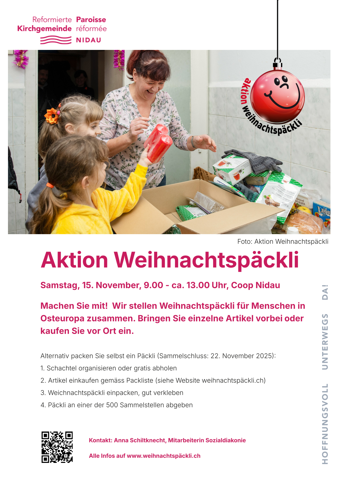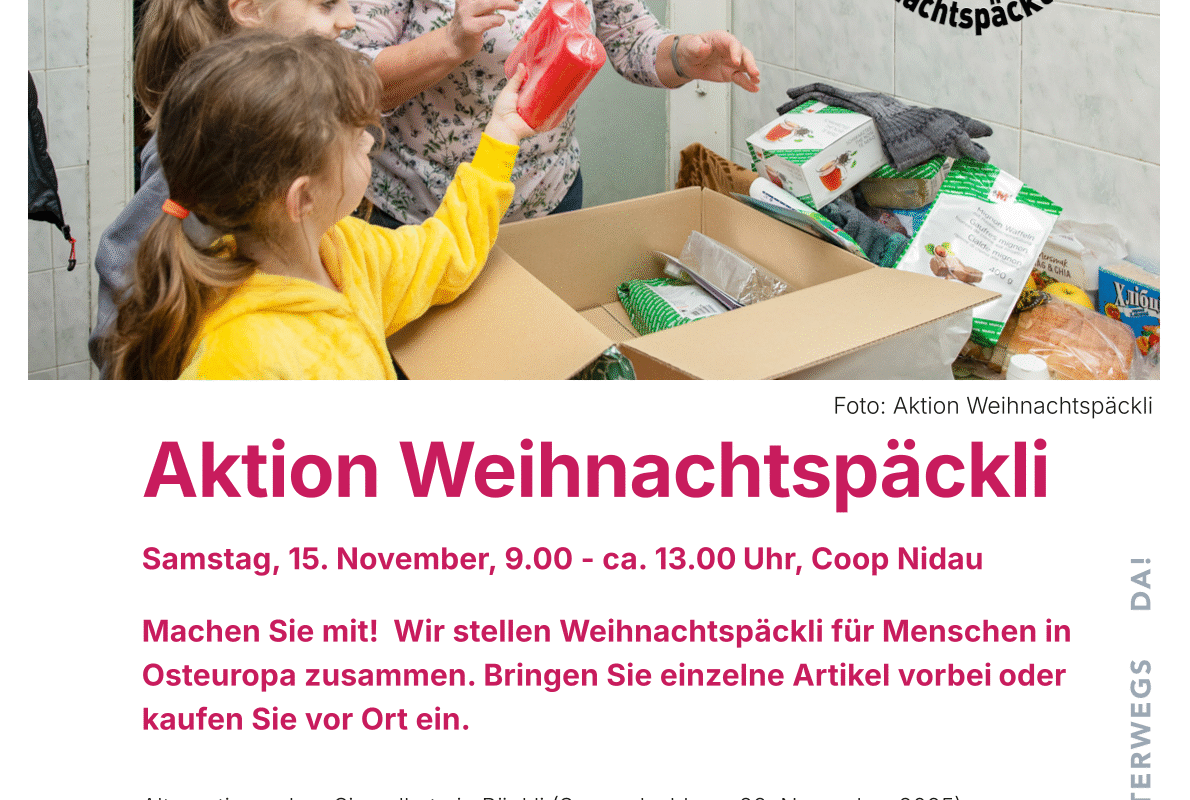 Mit Jugendlichen sammeln wir Artikel und lang haltbare Lebensmittel gemäss einer Liste und stellen Weihnachtspäckli für Menschen in Osteuropa zusammen. Kommen Sie vorbei, um uns dabei zu unterstützen, wir haben einen Stand im Coop Nidau.
